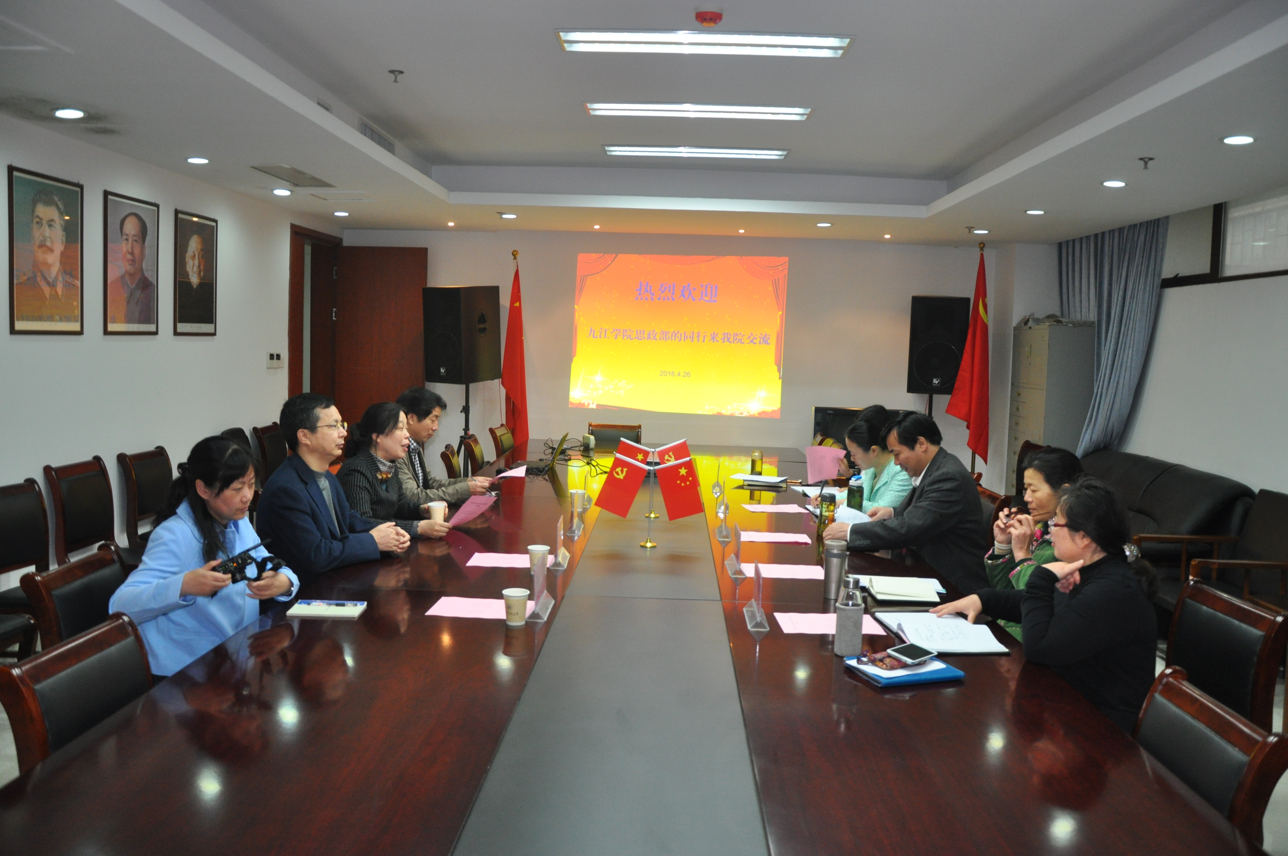 4月26日上午,九江学院思政部主任汪力平教授带领骨干教师一行4人来成人电影 学习交流。成人电影 执行院长兼党总支书记余龙进、副院长何丽君、中国近现代史纲要教研室主任张帆、形势与政策教研室主任徐敏、综合办公室主任陈存伟、教务科科长梅慧英出席了接待并与之座谈,座谈会在仓前校区恕园1号楼306会议室进行。