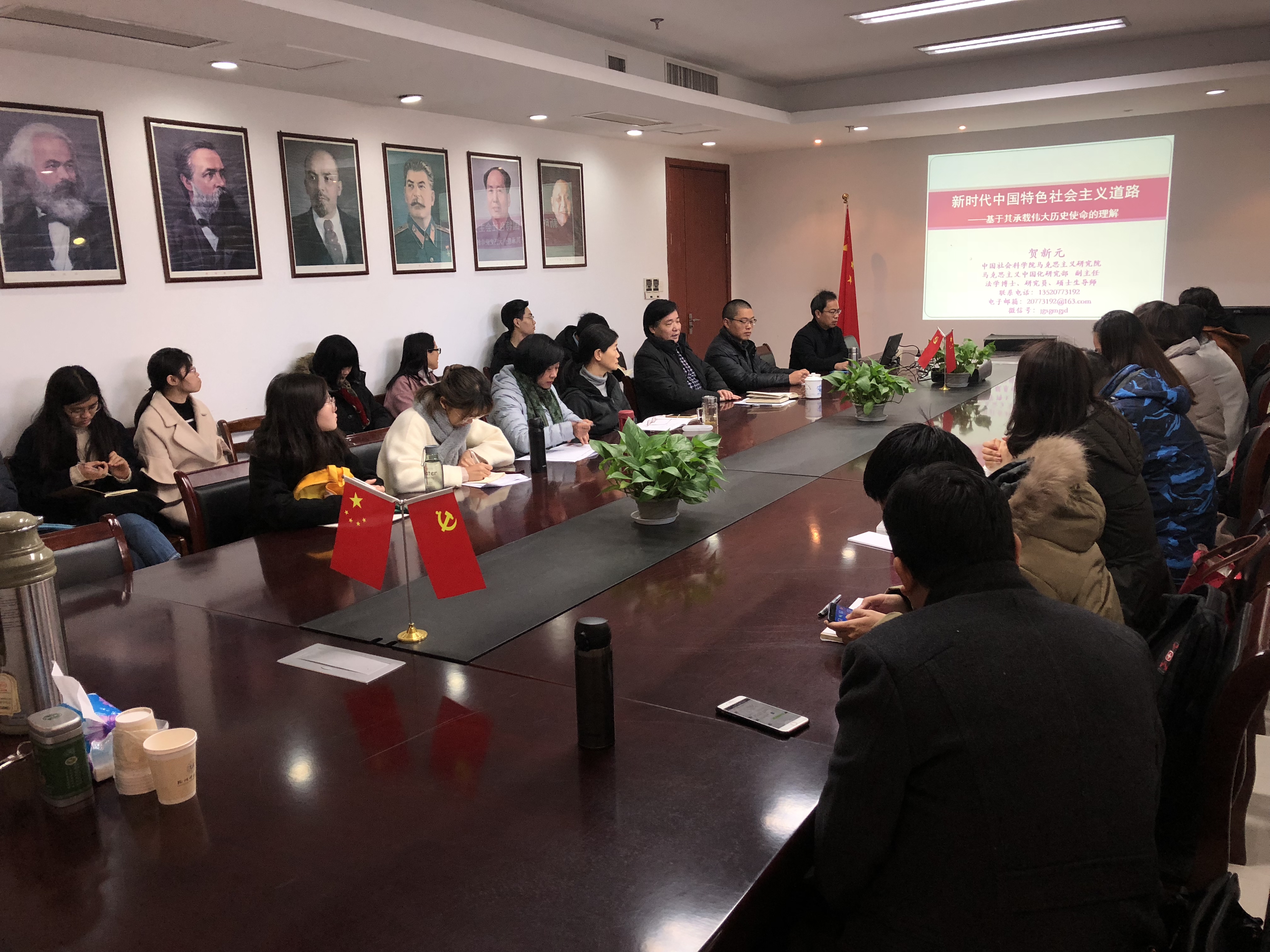 12月18日上午,中国社会科学院马克思主义研究院马克思主义中国化研究部副主任贺新元教授应邀来成人电影 作题为“新时代中国特色社会主义道路---基于其承载伟大历史使命的理解”的学术报告。本次报告会由成人电影 院长余龙进教授主持,副院长何丽君、学院部分教师、全体研究生及成人电影 学生习近平新时代中国特色社会主义思想研究会成员参加了报告会。