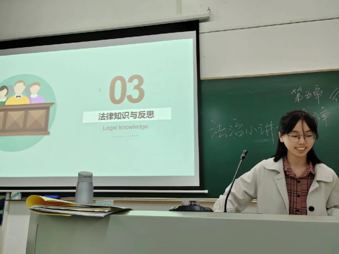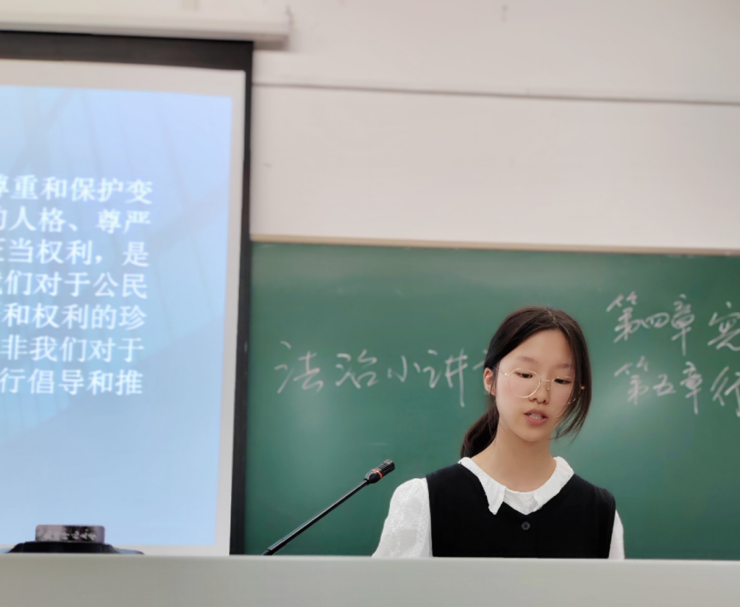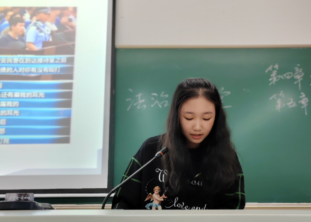 莫妍翌:法治小讲堂活动不仅提高了同学们的课堂参与度,而且“润物细无声”,在每一次的分享中,同学们慢慢提高了自己的法治素养,丰富了自己的法律知识,充分认识了学法用法的重要意义,增强使命感。这是非常具有教育意义的活动。