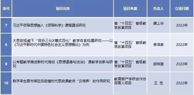 获批国家社会科学基金年度项目、后期资助项目共4项,和往年比是大丰收,创新高。这是在科研上继去年12月底获得一项省哲学社会科学优秀科研成果奖一等奖后,又一较大突破。另获包括教育部思政专项项目、浙江省哲学社会科学规划专项项目、浙江省软科学项目、“十四五”省级教学改革项目等才内的省部级项目10余项。依托科研骨干,自设8项国家社科基金项目预研培育项目。