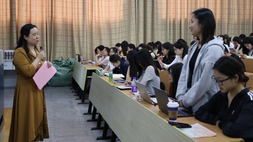 李老师从“你心目中的思想政治教育是什么样的”引入,勉励大家调整状态,加强对思政专业的认同感。接着,她点明了达成思政教育核心素养的理想与评价标准单一的现实之间的差距,引导学生在教学实际中将灌输教学和灵活教学相结合。最后,她就“如何成为一名合格的思想政治老师”这一议题提出了四点建议:一是要从语言、仪态等方面塑造自信的教师风范;二是要加强政治的敏感性,把时政性新闻融入到课堂教学之中;三是要厚植爱国主义情怀,坚定理想信念;四是要习得师范生技能,提升教学综合能力。
