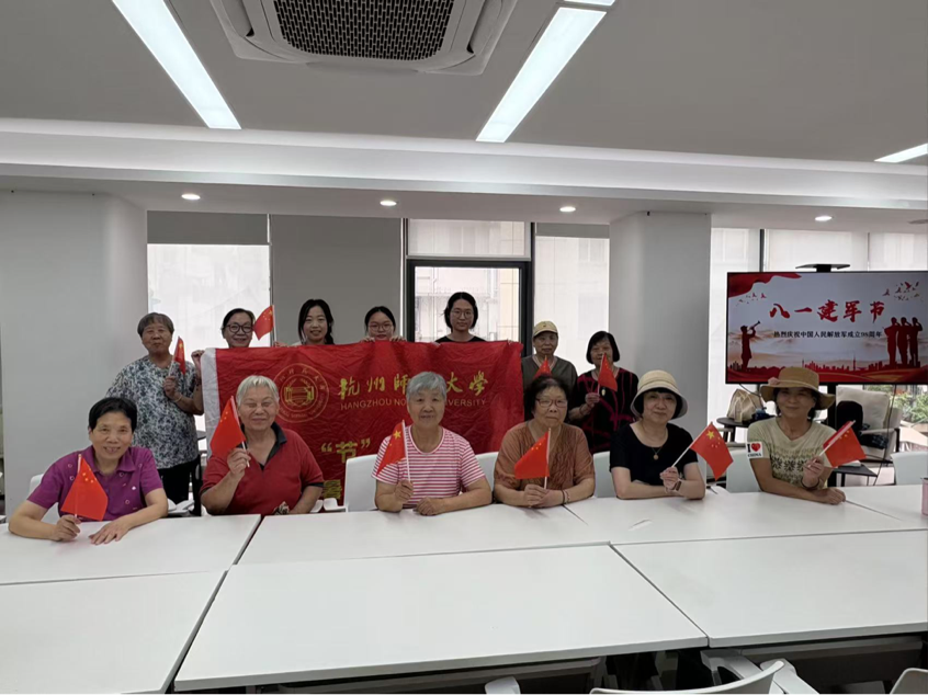 银发老人们在《南昌起义》的短片讲解中追忆红色足迹。当主持人抛出“八一代表什么”的互动问题时,老人们热情地分享自己的见解,用饱经岁月的声音讲述着对军人的深切敬意。在防暑妙招学习区,老年学员们认真练习冲手腕降温技巧,仔细地阅读防暑指南。后续红歌联唱环节更是将活动推向高潮。当《歌唱祖国》的旋律响起,全场参与者们挥舞国旗齐声合唱,嘹亮的歌声在活动室回荡。最后,在致敬合影环节,老人们举着国旗,用最灿烂的笑容向军人致敬。