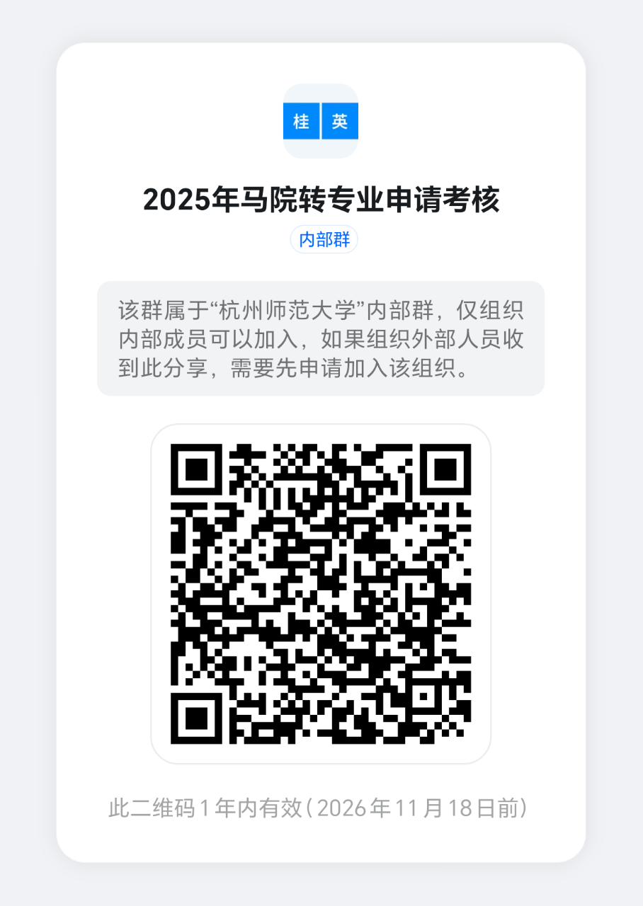 各位同学,根据学校2025年转专业的总体安排,结合学院实际,请拟申请转专业学生根据以下成人电影 转专业考核方案及考核安排来操作。报名需提交转专业申请表纸质材料,提交地点:下沙校区行政楼212,仓前校区恕园26-304。系统报名成功的学生请加入马院转专业通知钉钉群,二维码:
